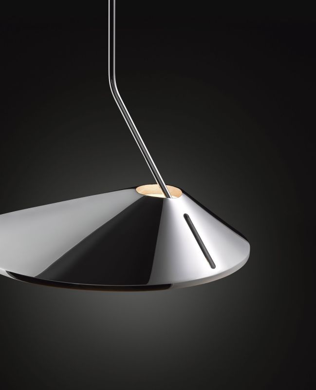 Een van de meest kenmerkende tekens uit Vietnam is de hoed die door vrouwen op het platteland wordt gebruikt om zich te beschermen tegen de zon en de regen en als mand om voedsel te dragen. NÓN LÁ is de naam die wordt gebruikt om deze Vietnamese hoed te beschrijven en het is ook de naam die wij voor deze lamp hebben gekozen. Op die manier brengen wij hulde aan zijn vorm en eeuwige cultuur. De eenvoud van deze kegelvormige lamp, biedt een lichte en resistente structuur met een avant-gardistisch tintje dankzij de gedecentraliseerde lichtholte. De kap van de lamp is vervaardigd uit aluminium en vervolgens geplateerd of gelakt. De gietijzeren voet van de lamp is hoekig gevormd, waardoor hij ruwer oogt, in tegenstelling tot de subtiele kegelvormige kap. Nón Lá vult de ruimte met direct onderlicht en bevat een diffuser van polycarbonaat waarin een dimmende, zelfgemaakte led-plaat is ondergebracht.