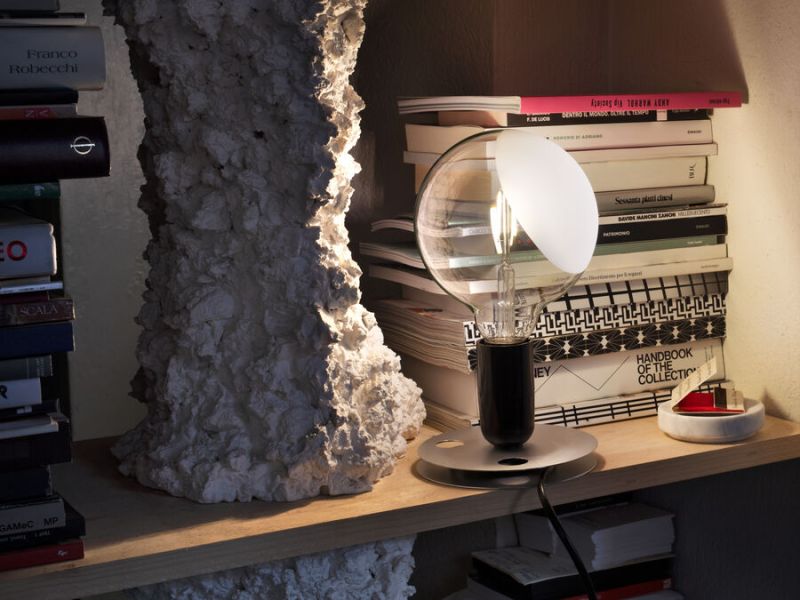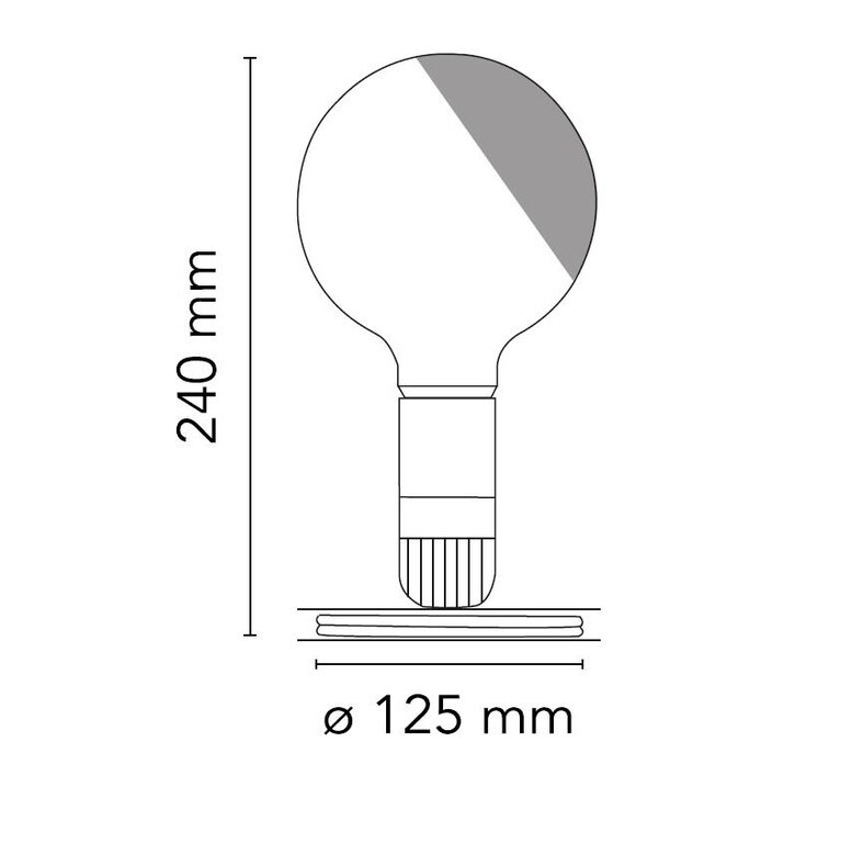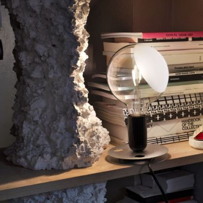 Tafellamp met direct, diffuus licht. De geanodiseerde aluminium voet dient om het overtollige netsnoer op te vangen. Lamphouder van bakeliet, gelakt in de kleuren oranje en zwart, passend bij de schakelaar. Heldere globe lamp is gedeeltelijk gezandstraald om het licht te verspreiden.